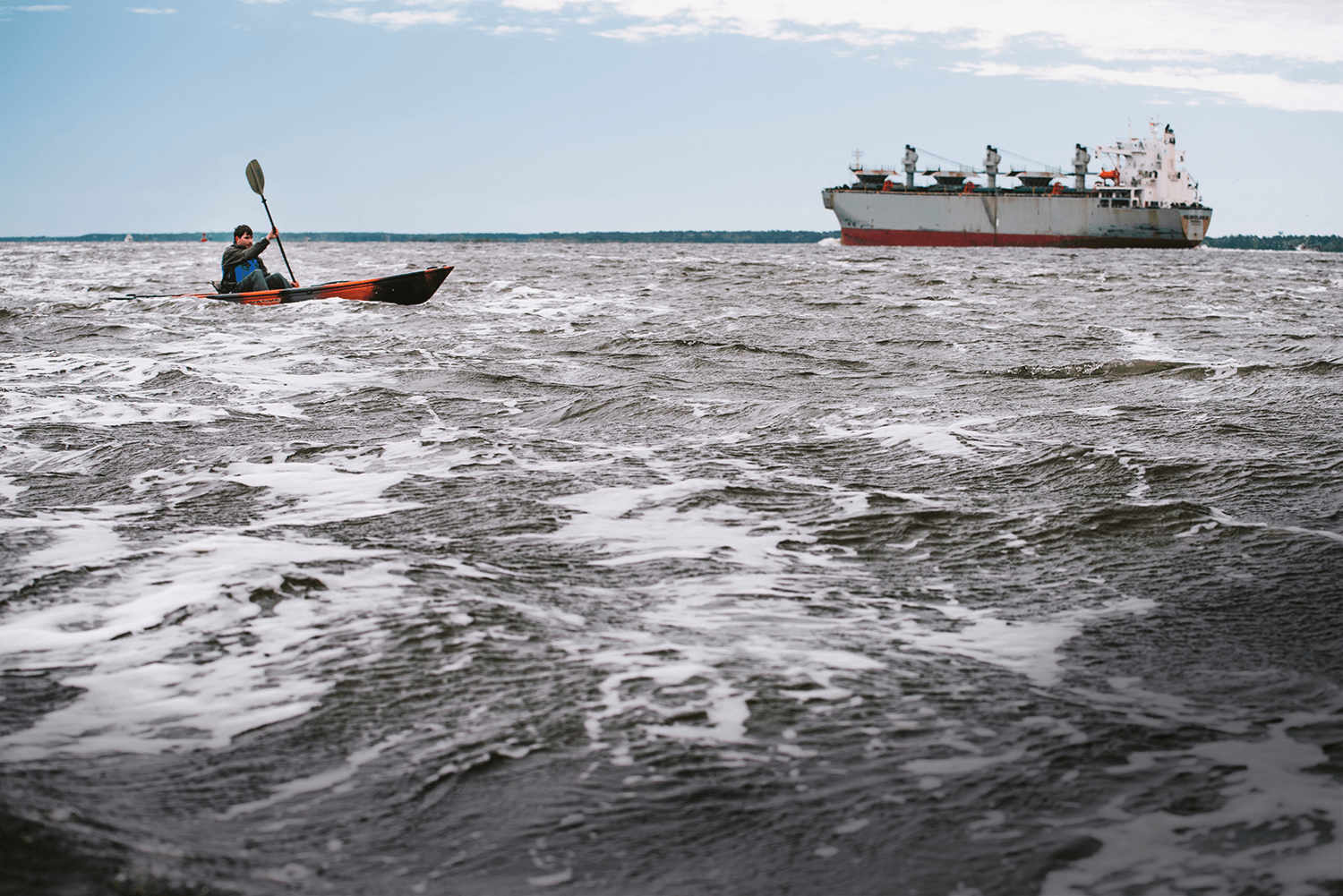 The river that had held me in its cozy embrace over the past seven days was gone. All around me: barges, Panamax tankers, and shrimp trawlers plowed through the water with ease. I worried that the wrong wave might capsize my open-top boat, and I would be an unseeable speck in the angry foam — a mile of water in every direction. I kept going, futilely, drawing a straight line, paddling toward Kemp and Chris ahead of me, trying not to drift toward the ominous warning signs on poles in the water around Sunny Point, where gunboats patrolled near the shore in the distance.