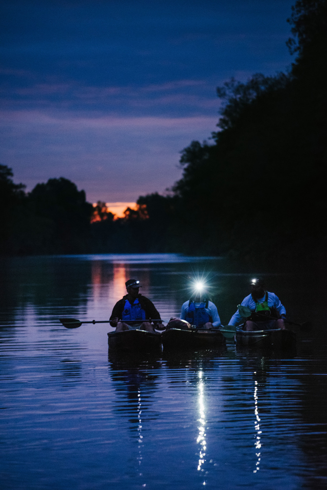We pressed on for five extra miles before pulling up at a landing. As we started to set up our tents and dry out our gear underneath an orange sky, an oversize Ford pickup emerged from the woods. A white-bearded man stepped out and told us his wife simply wouldn’t allow us to camp down here. She demanded that he bring us all back to the house to sleep indoors. Soon, we were whizzing through the dark woods in a truck bed. More river magic.