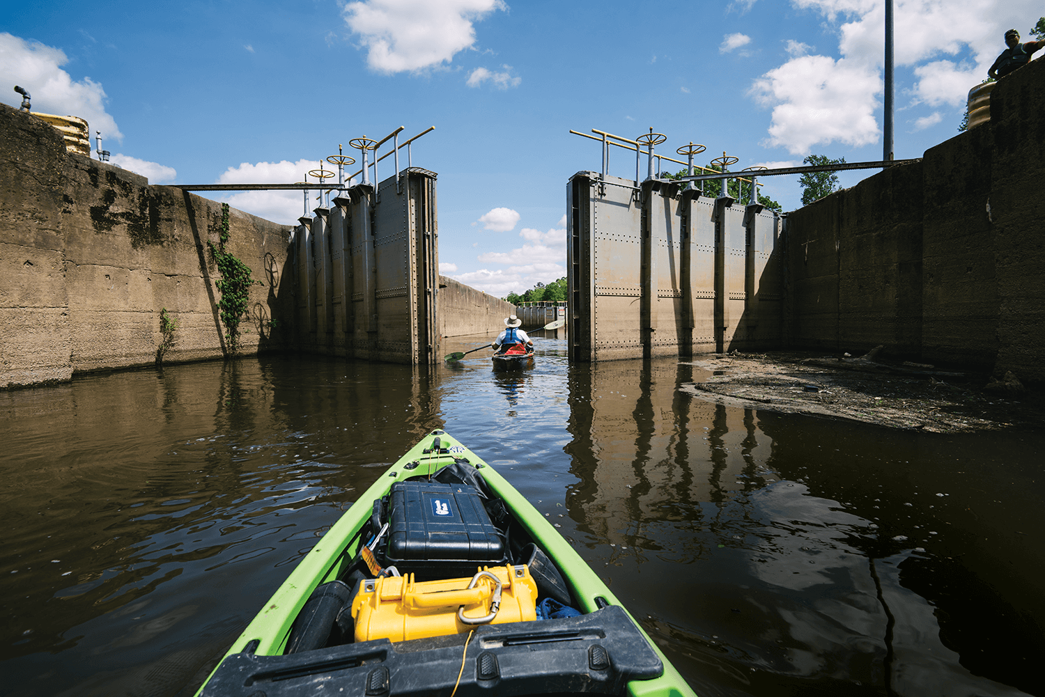 We figured we were going to have to carry everything around this lock, too, until Kemp spotted an Army Corps of Engineers pickup truck. The lockmaster was here, and Kemp started giving the man his best sales pitch. The lockmaster stopped him. “You guys want locked through, don’t you?” the lockmaster said. The doors closed. The water lowered. Ten minutes in the lock saved us an hour.