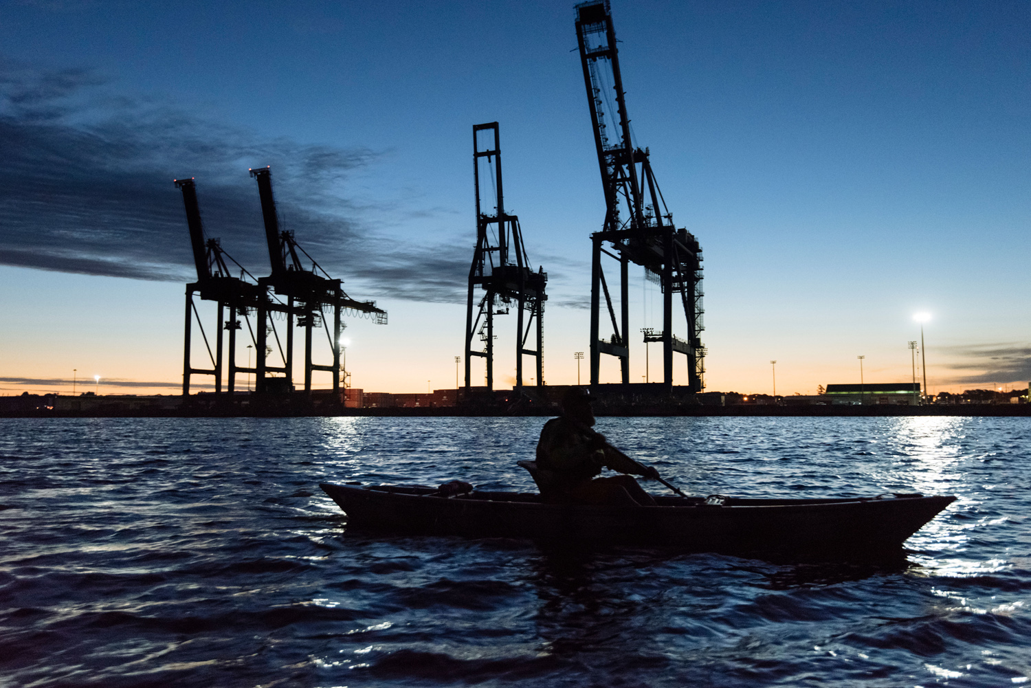 The last day of paddling was an afterthought. We had 26 miles to go, and the wind was at our backs, with a falling tide to push us. We’d reach the river’s end by lunchtime. We left Dram Tree Park at 5:30 a.m. with light boats, carrying just some water and snacks. We paddled into the blackness of the 42-foot-deep shipping channel and quickly encountered a container ship, the Maersk Wakayama, being guided by a tugboat to the mile-long State Port just south of downtown. We gave it a wide berth. The ship was almost the size of two football fields and its captain likely couldn’t see us.